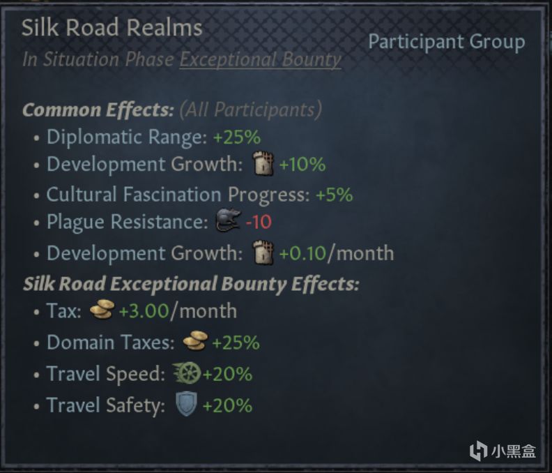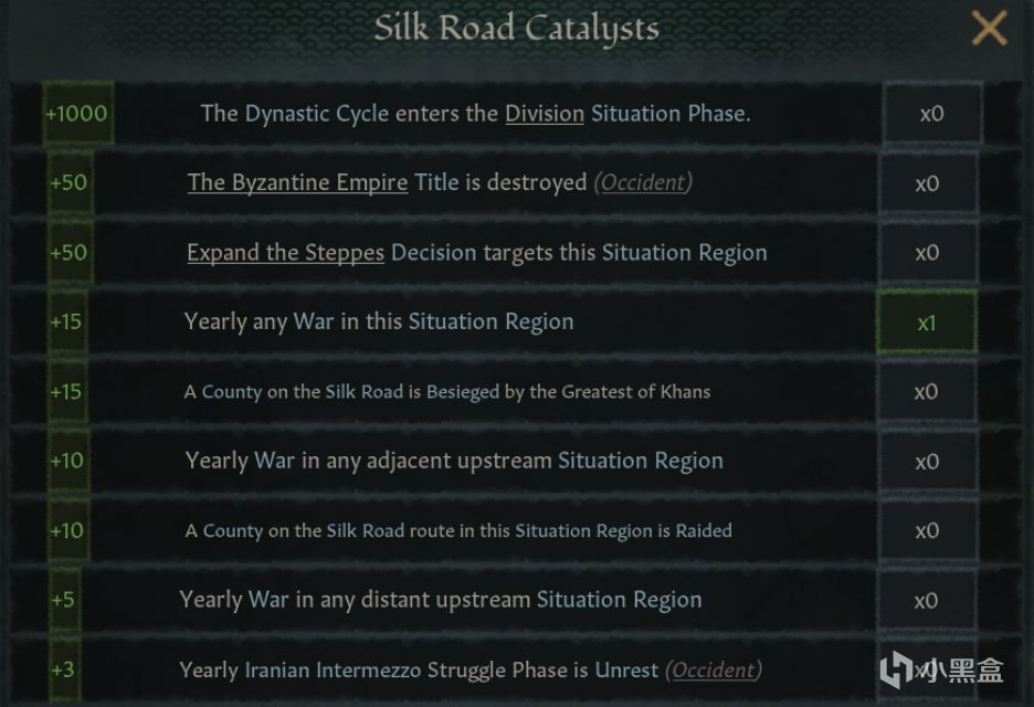 那么,阶段是如何切换的呢?与其他局势类似,行动和事件可以触发诱因,推动局势进入新的生效阶段。但丝绸之路局势的独特之处在于,这些诱因是分别作用于单独区域的。某个区域繁荣发展的同时,另一个区域可以正饱受战乱困扰。