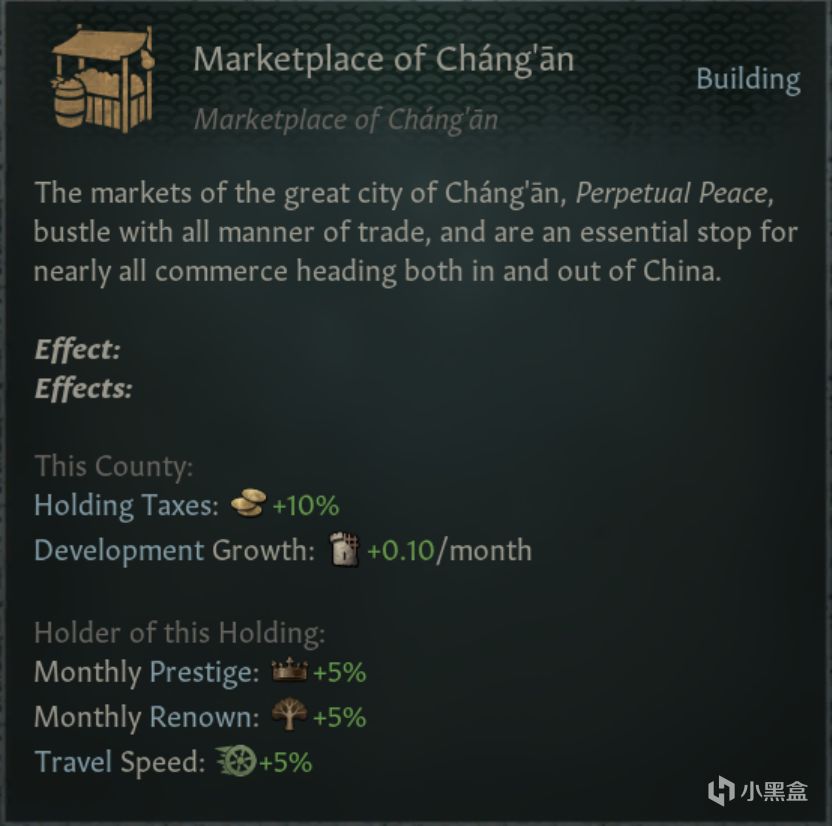 每个区域在固定地点拥有一个单一的枢纽特殊建筑(Hub Special Building),代表一个关键的区域贸易中心,例如吐蕃逻些的“冲”(Khrom)或印度拉合尔的“巴扎”(Bazaar)。这些枢纽提供收入和基于阶段的区域增益,并且可以再升一级,为其持有者提供额外增益。建造或升级枢纽也会触发一个诱因,推动区域走向更繁荣的阶段。
