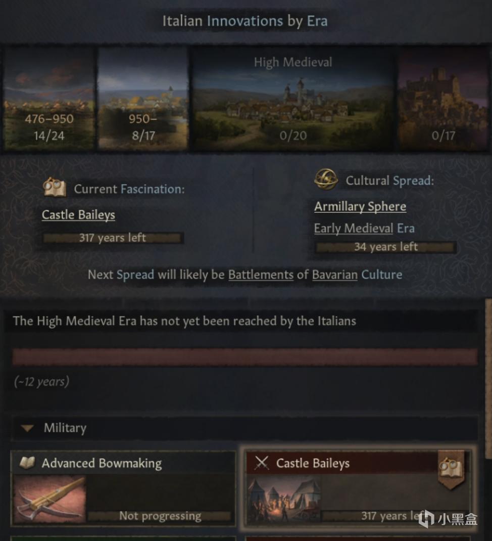 当浏览本文化尚未达到的时代时,界面会明确显示限制条件,偏好超世代的革新也会显示超长的预计完成时间。换句话说,这能明确表述研究超时代革新是缓慢但可能的这件事。