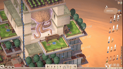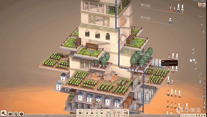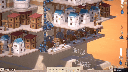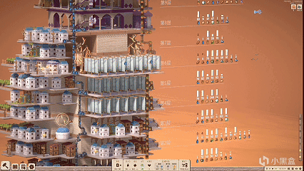 中间是塔身,左边是建筑菜单,右边是生产统计,下面是高塔总览。每一层的生产和需求情况常显在塔体右侧,随着视角旋转而移动。柱状图+数字+图标,红色代表紧缺,每层物资冗余缺乏一目了然。不需要打开多个界面,F1、F2、F3、F4切换成资源、塔民、饮食和增益四层显示,整个画面和UI看起来简洁明了,设计好评如潮。