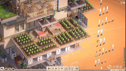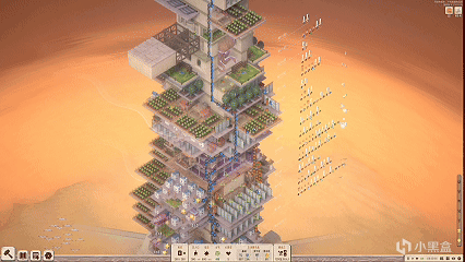于是,就有从上往下的玻璃管道(运输液体)和木管道(运输固体),从下往上的热气球。实现各个楼层的资源流通,释放了搬运工劳动力。由于是在外立面搭建,管道路线弯曲,强迫症玩家慎用。