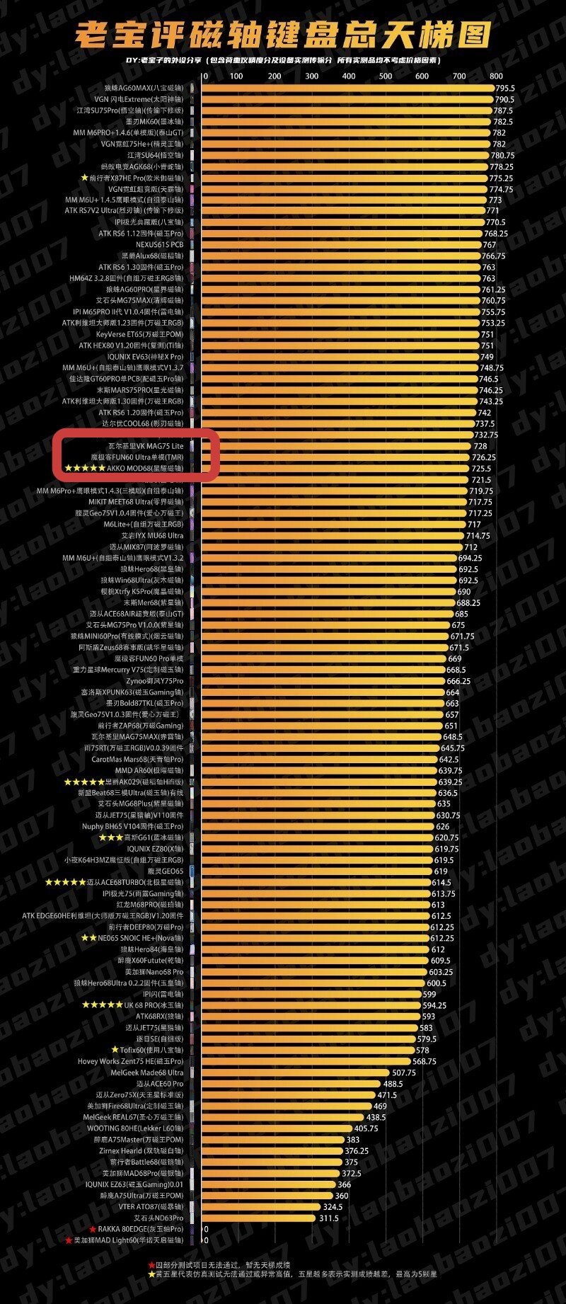 最后分数749分,甚至比rs6还低几分,我觉得着实说不过去,但是考虑到大厂的品牌影响力!和独一档的外观加上神秘x轴的噱头,这把键盘还是可以入的,不过这个价格已经跟性价比没有任何关系了(如果想要性能就去买狼蛛ag60max 也就是榜一)
