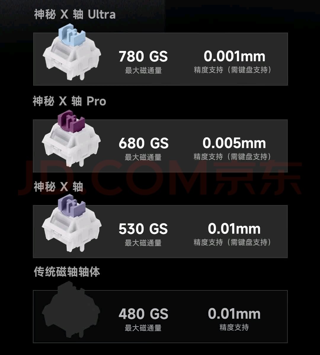 磁轴,轴体内置磁铁,底部主板配备霍尔传感器,按下时磁铁靠近传感器产生超过阈值的霍尔电压实现触发。所以可以通过软件,设定触发行程