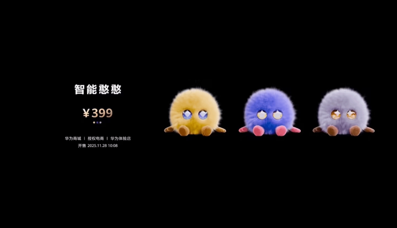 华为常务董事、终端BG董事长余承东在11月25日的新品发布会上宣布,推出首款陪聊机器人“智能憨憨”,售价399元,将于11月28日10时08分正式开售。