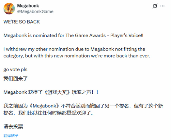 开发者 vedinad 对这次奇迹般的复活表示高兴,并已向粉丝发文呼吁大家为《Megabonk》投票。