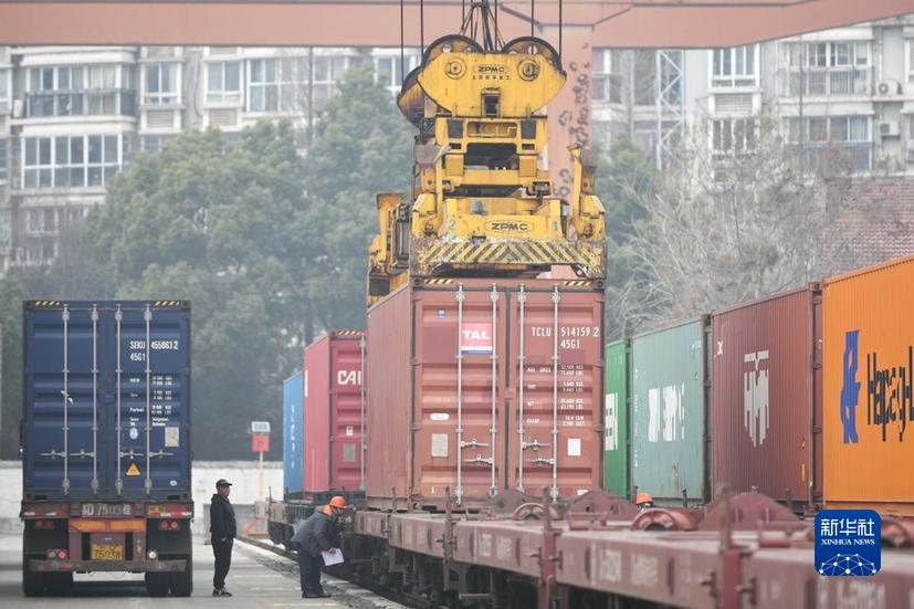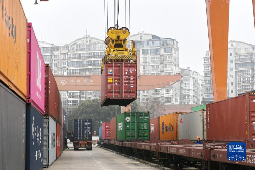 2月8日,在常州站铁路货场,装载新能源汽车的集装箱被装上海铁联运班列。