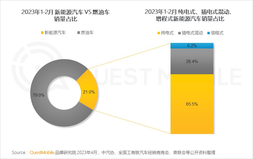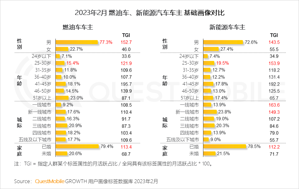 QuestMobile数据显示,2023年前两月,新能源汽车销量持续攀升至汽车总销量的超2成,其中,纯电式占据主导地位;从用户画像上看,一线、新一线的女性用户、25-30岁用户,对新能源汽车的接受度超过了燃油车,同时,线上消费能力来看,在3000元以上区间,新能源车主渗透率远高于燃油车主。