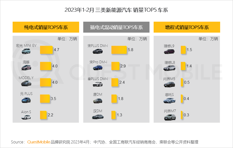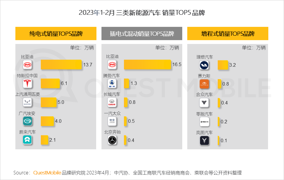 5、从细分赛道表现来看,比亚迪旗下纯电式、插电混动式销量占绝对优势;理想汽车则在增程式阵营中占据更多市场份额