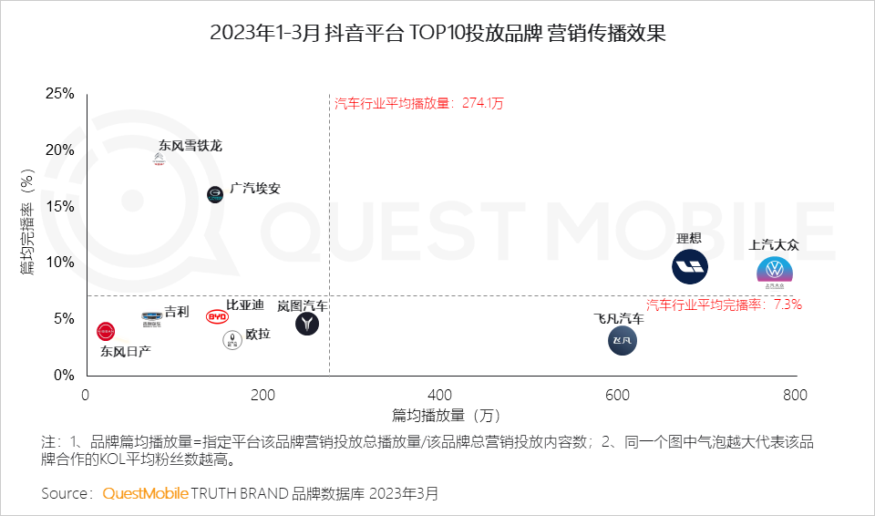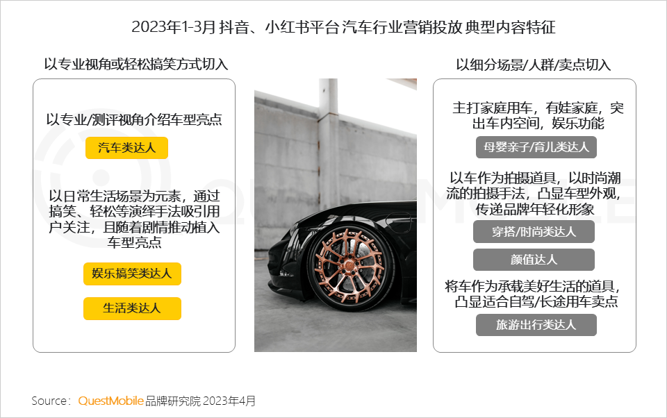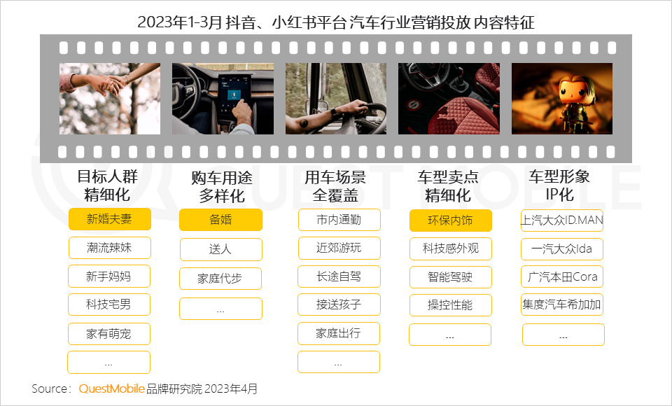 QuestMobile数据显示,2023年Q1,抖音、小红书站内汽车软广投放合计达7000条。抖音是各大车企的重要宣传阵地,小红书也逐步成为汽车行业营销新战场,参与品牌数达52个。