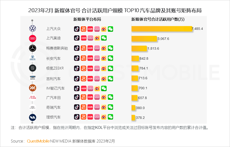 4、另一方面,车企也在全面布局各大内容平台官号运营,沉淀用户,减少流量依赖;头部传统车企的超强品牌影响力仍在,如上汽大众跨平台合计触达用户规模超七千万