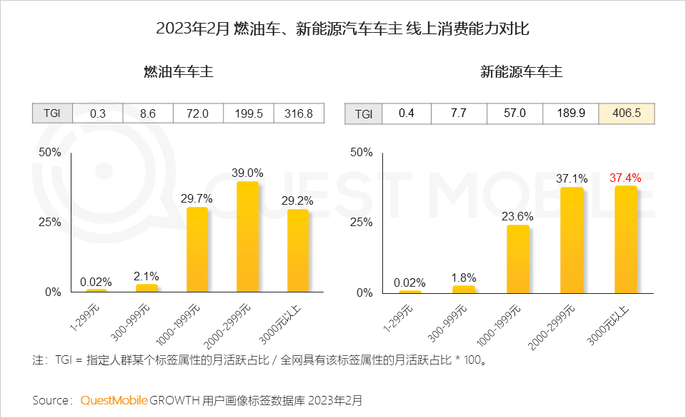 3、从线上消费能力来看,新能源汽车车主的平均消费水平也更高