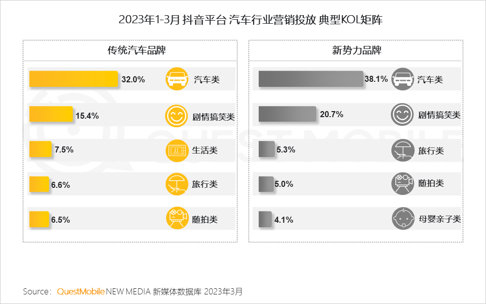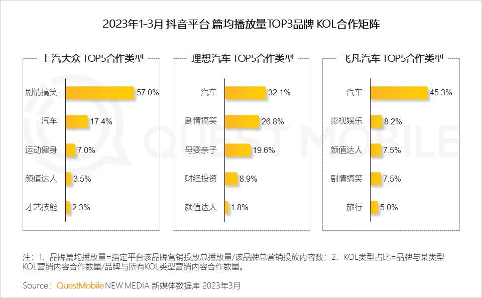 从内容营销的形态看,人群精细化、场景多元化,催生了诸多模式,例如,拟人化IP打造、达人矩阵模式、跨界时尚穿搭和旅游出行等等,构成了“车型卖点深度植入”契合圈层、场景的特点;诸如露营、户外的美好展现,搞笑达人创作以保证收视等等,吸引细分人群的关注,以抖音TOP品牌投放为例,Q1上汽大众、理想汽车与剧情搞笑类达人合作,传播效果良好,不过,随着达人参与越来越多,爆款的难度也越来越大……