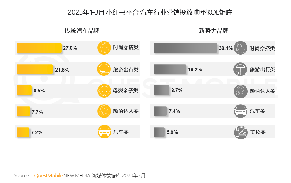 4、小红书站内则更多借助时尚穿搭、旅游出行此类“平台主力军”的影响力实现宣传和推广;相反,汽车类达人的启用则明显低于抖音