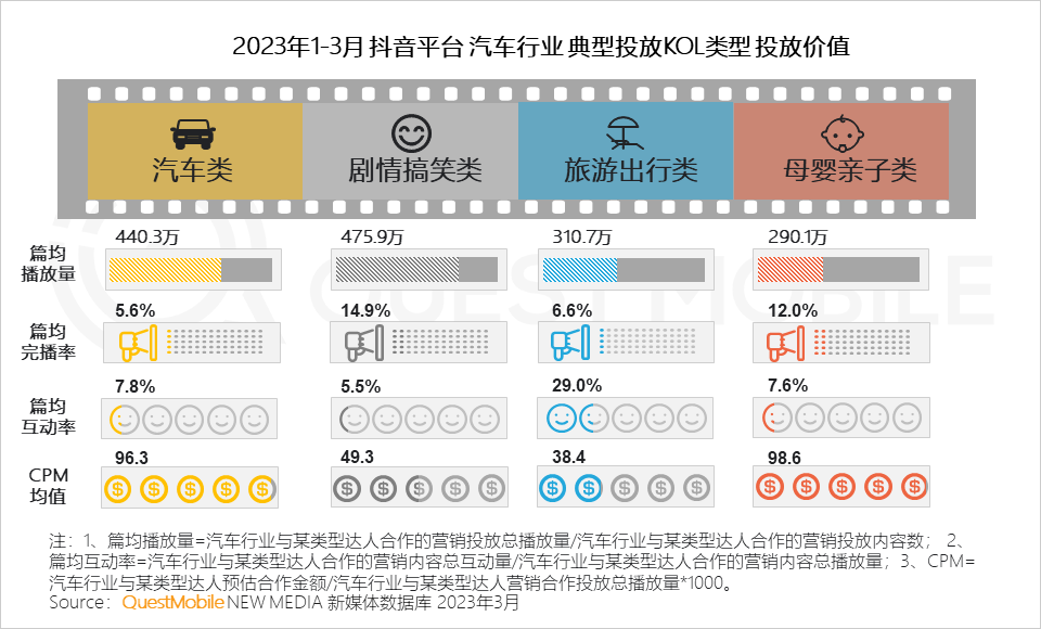 相比之下,汽车类达人虽然具备传播保障,但价格门槛也更高,主攻家庭用车的母婴类达人,受其目标群体基数影响,传播表现一般,但胜在内容质量高,因此完播率表现较好。