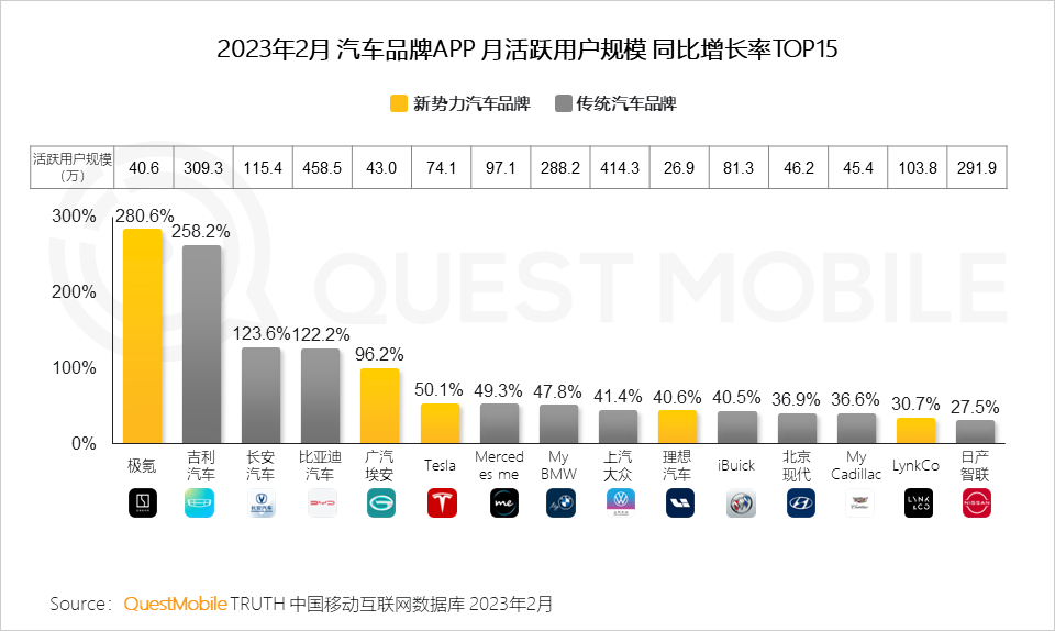 QuestMobile数据显示,2023年2月,极氪、广汽埃安APP活跃用户同比分别增长280.6%和96.2%。