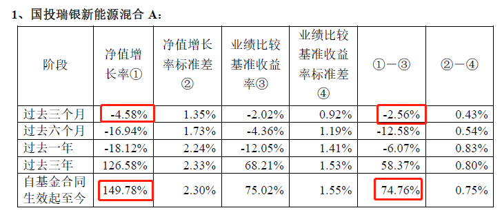 2023年一季度,国投瑞银新能源混合A净值回撤4.58%,跑输业绩比较基准2.56个百分点;成立以来至2023年一季度末,该基金累计收益率为149.78%,跑赢业绩比较基准74.76个百分点。