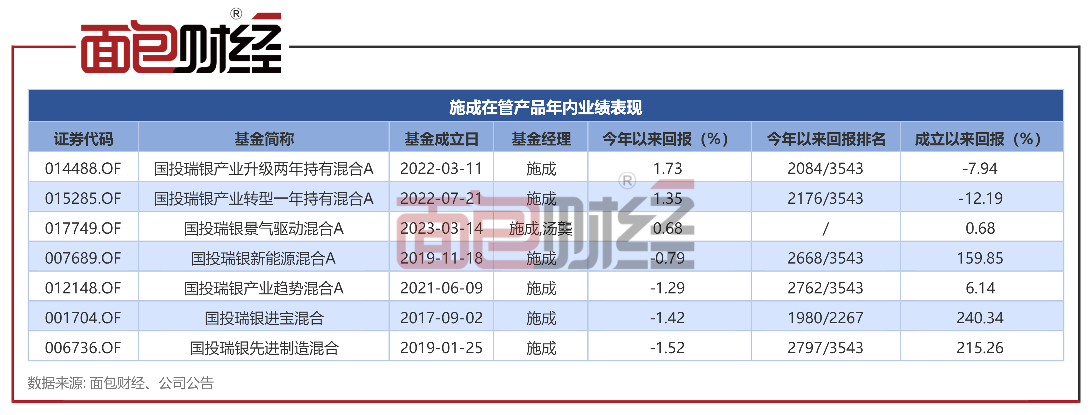截至2023年一季度末,施成主要管理国投瑞银新能源混合、国投瑞银产业趋势混合、国投瑞银先进制造混合等7只产品(包括共同管理产品),合计管理规模超过200亿元。