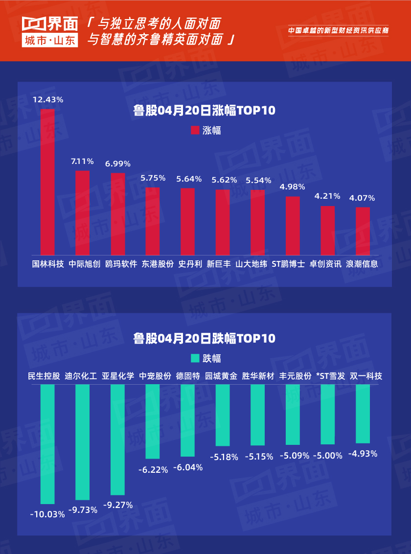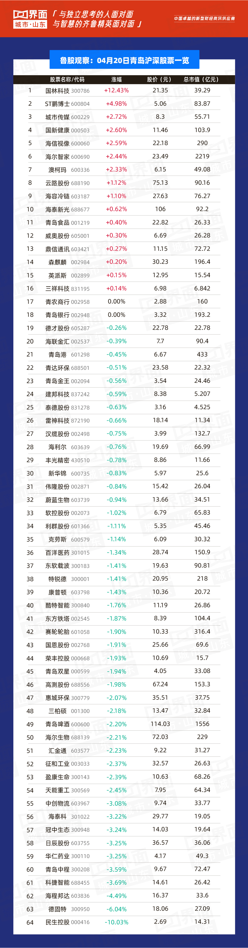 青岛市涨幅榜首:国林科技(300786),涨幅12.43%,股价21.35元,总市值39.29亿元;