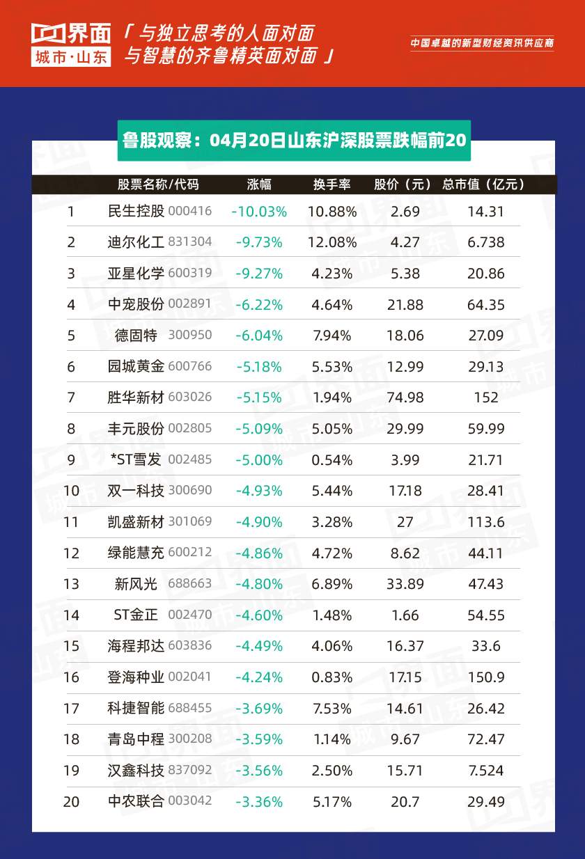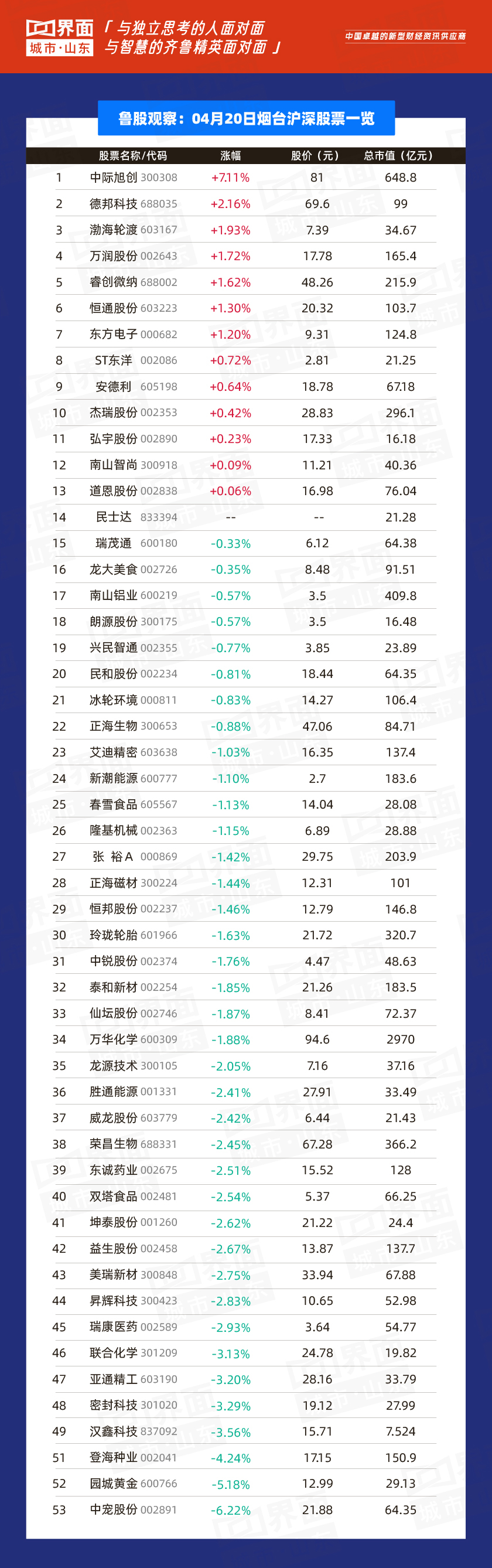 4月20日,山东省内沪深京股票有86只个股上涨,201只个股下跌;总市值过千亿的有万华化学(600309)、海尔智家(600690)、兖州煤业(600188)、青岛啤酒(600600)、山东黄金(600547)、中航沈飞(600760)、潍柴动力(000338)共7家,500亿-1000亿的共有6家,分别是华鲁恒升(600426)、歌尔股份(002241)、浪潮信息(000977)、中际旭创(300308)、华电国际(600027)、中泰证券(600918)。