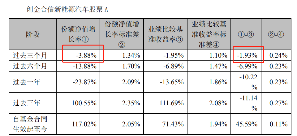 一季报显示,创金合信新能源汽车股票A的报告期末单位净值为2.1702元,一季度净值下跌3.88%,跑输基准1.93个百分点。