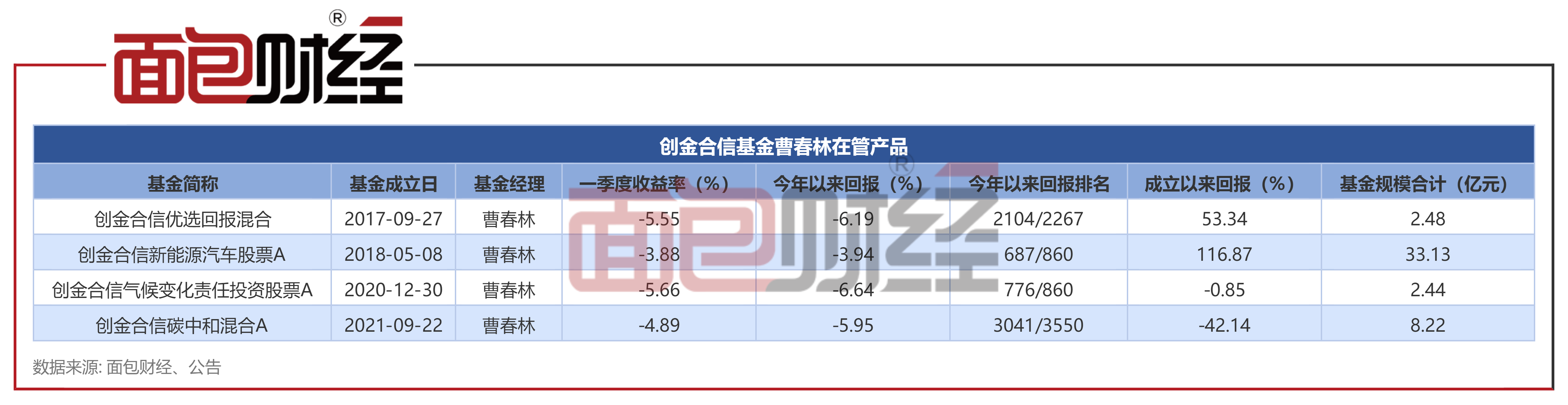 目前,曹春林主要管理创金合信新能源汽车股票、创金合信碳中和混合、创金合信优选回报混合等4只产品(初始基金口径),上述产品合计规模约46.28亿元。