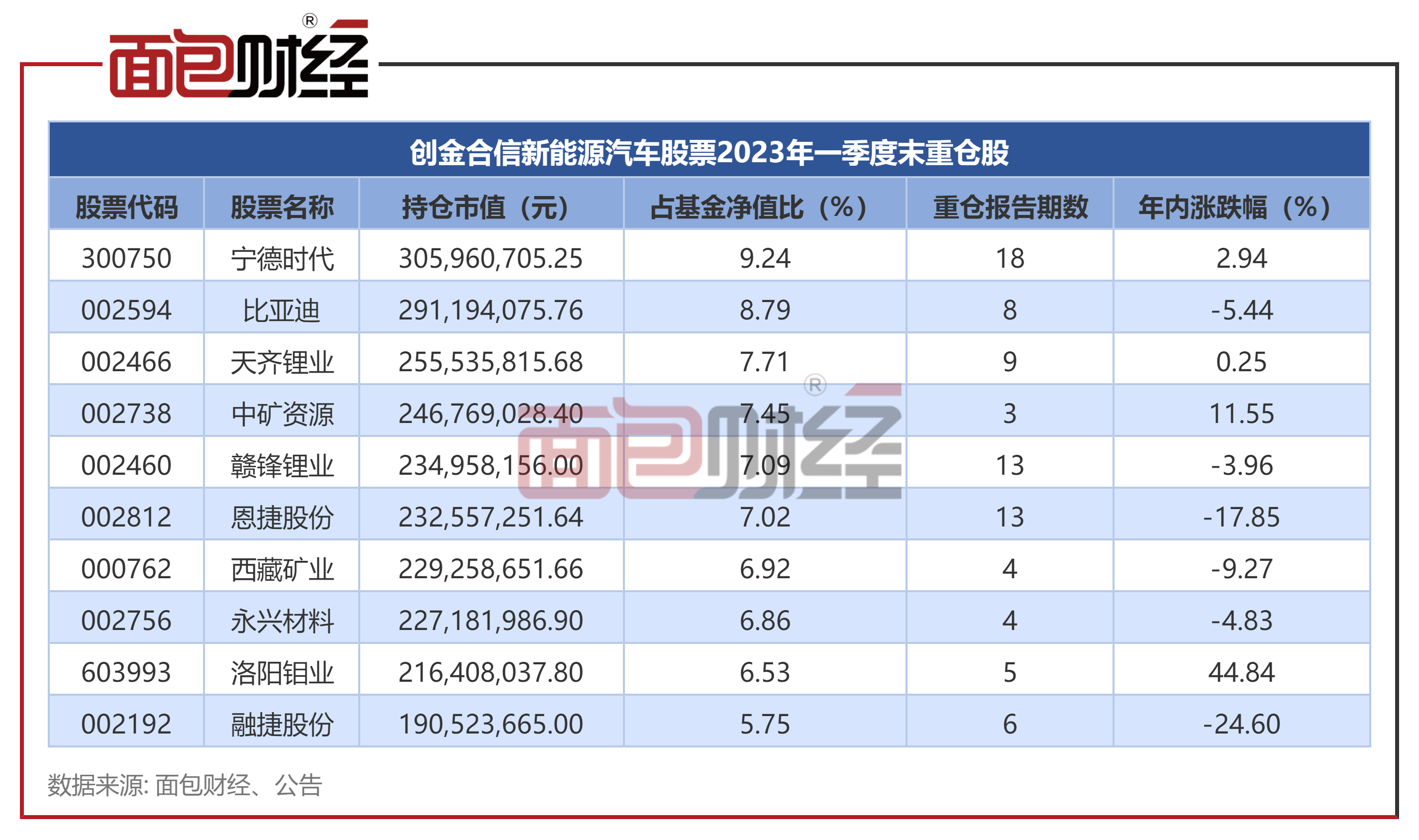 2023年一季度末,创金合信新能源汽车股票的股票持仓占基金总资产的比例为94.04%,股票仓位达到运作以来最高比例。其中,前十大重仓股占基金资产净值的比例为73.36%,持仓较为集中。