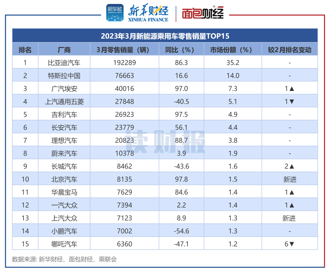 2023年3月,比亚迪汽车的月销量位居新能源乘用车销售榜第一,达到19.23万辆,特斯拉中国、广汽埃安的月销量均超过3万辆。另外,北京汽车、上汽大众在3月新进TOP15榜单。