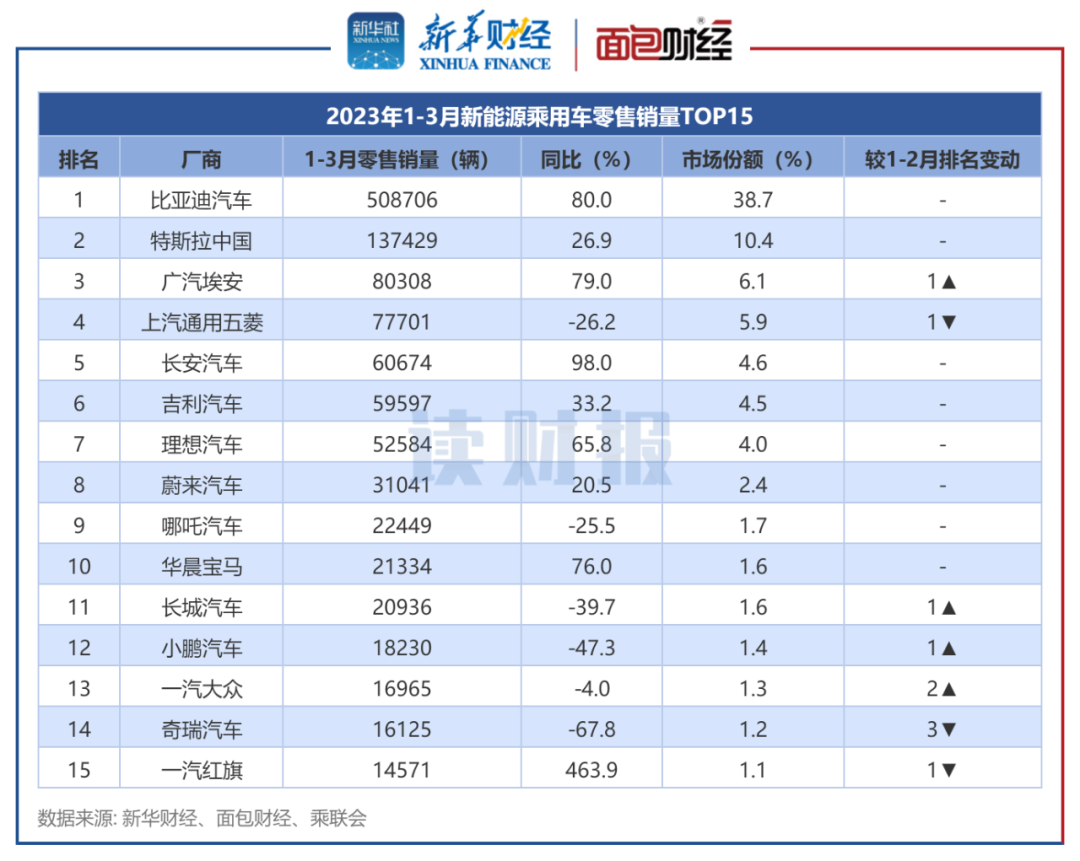统计2023年1-3月新能源乘用车累计销量发现,比亚迪汽车、特斯拉中国位居前二,上汽通用五菱掉出前三队伍。