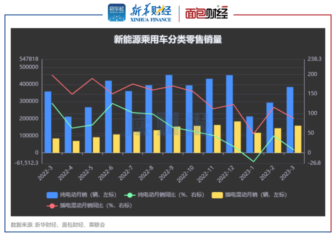 新华财经和面包财经研究员根据乘联会披露的零售数据统计,2023年3月,国内新能源乘用车销量达到54.57万辆,占狭义乘用车零售销量的34.3%,环比增加2.6个百分点。