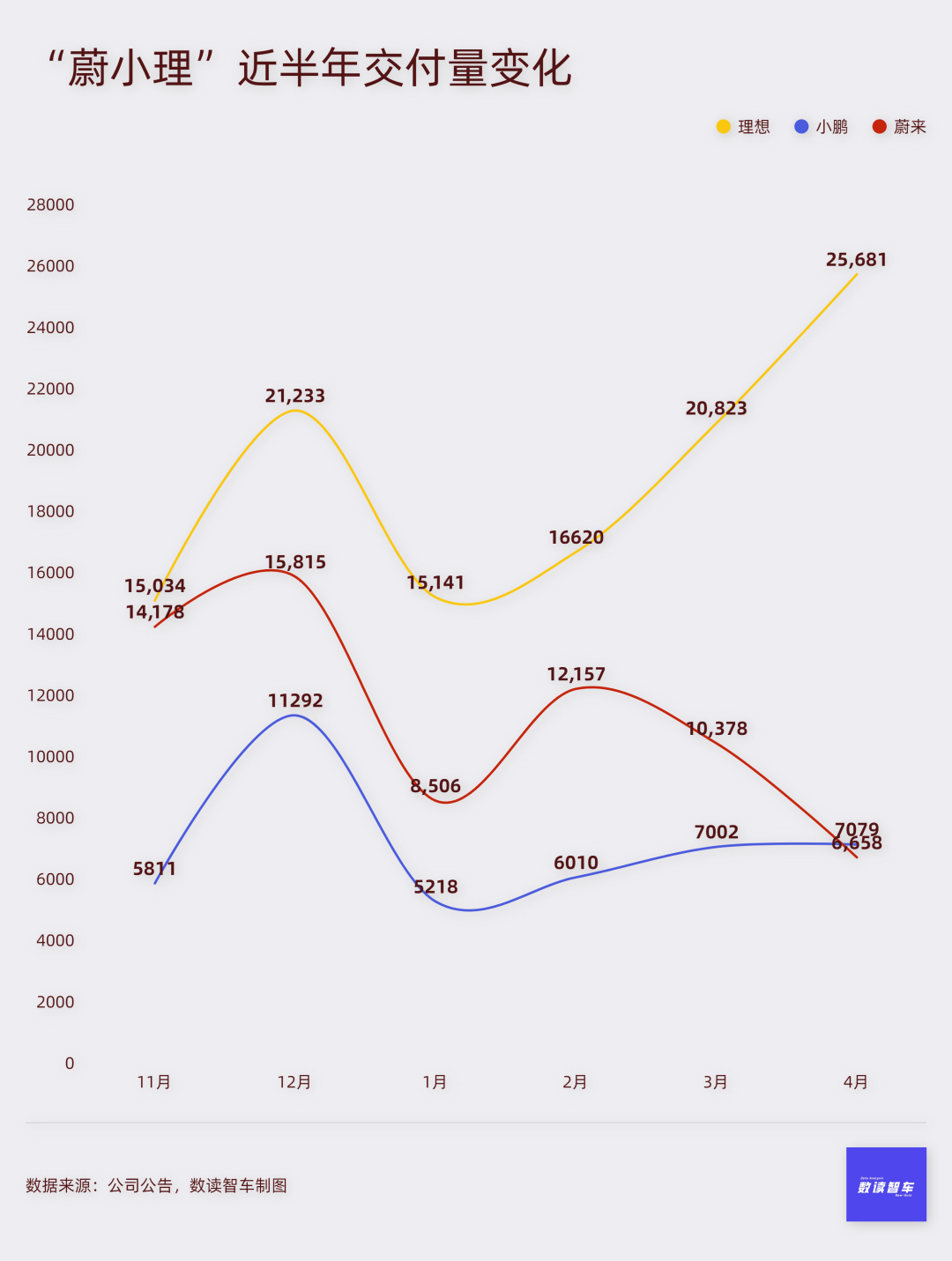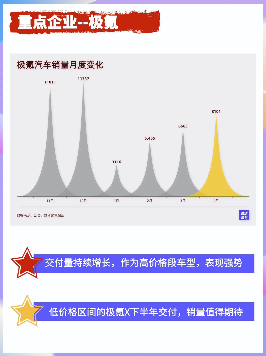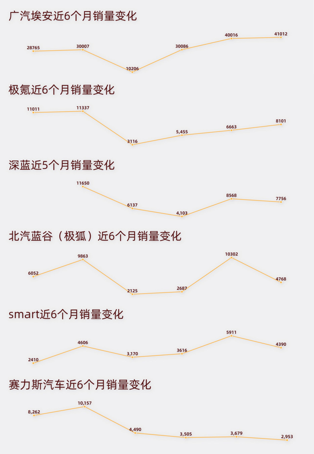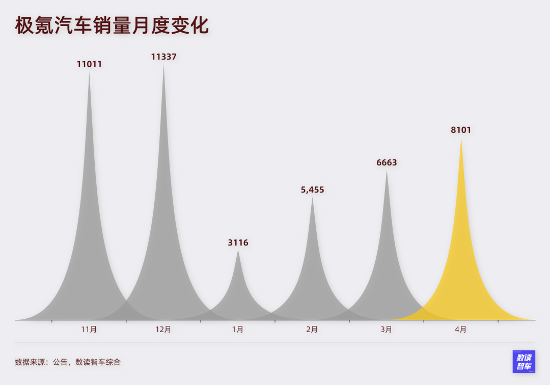 极氪大有脱颖而出的迹象。4月销量站上8000台,前四个月复合增长率37.5%。考虑到低价车型极氪X还未正式交付,重新实现月销过万或许就在5月。