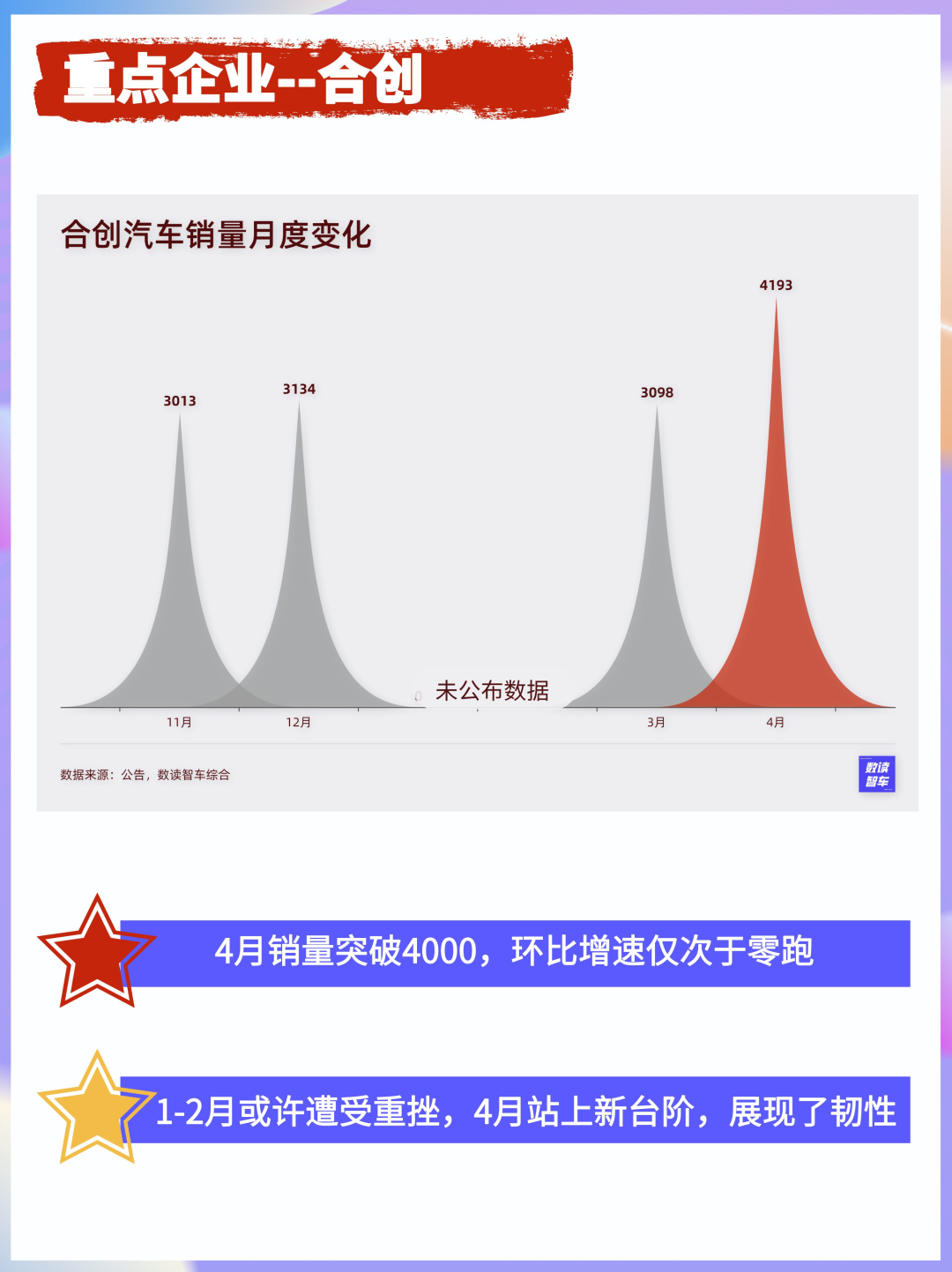4月,合创汽车交付量达到4193辆,环比增长35.3%,是目前已公布销量车型中增速最快的车企之一(也与3月基数小有一定关系),取得了新的突破。
