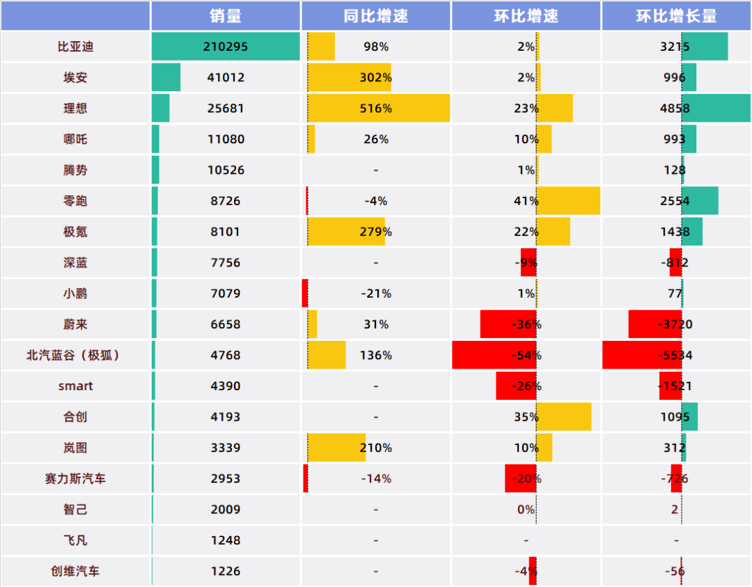 按照同比的口径,18家车企中有11家可以同期比较,其中,只有小鹏、零跑和赛力斯汽车(以问界系列为主)出现了同比下滑,另外8家均同比上涨。其中,理想汽车同比增速最快,高达516.3%。另外有埃安同比增速301.6%;极氪同比增长279.1%;岚图同比增长210%;北汽蓝谷(极狐)同比增长136.4%。