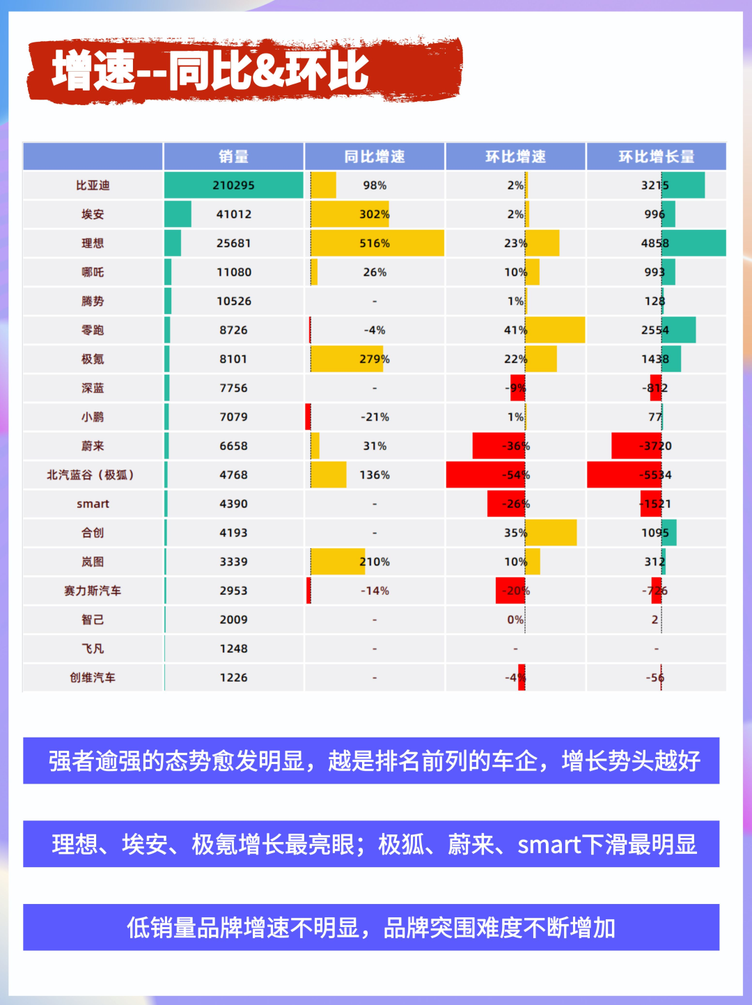 可以看到,排名越靠前、销量越高的车企,反而增速越快,排名越靠中下游的车企,表现越波动,马太效应的趋势很明显。