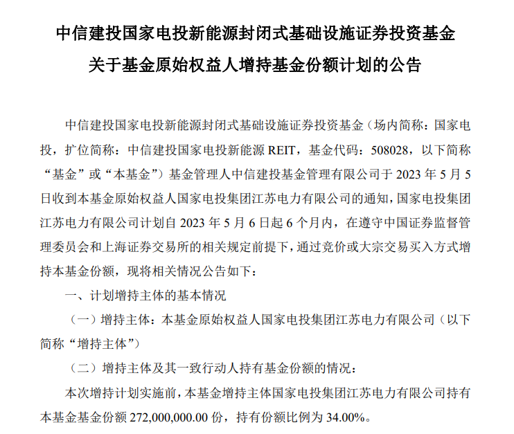 今日,中信建投国家电投新能源REIT发布公告,称原始权益人国家电投集团江苏电力有限公司计划自2023年5月6日起6个月内,在二级市场通过竞价或大宗交易买入方式增持该基金份额。