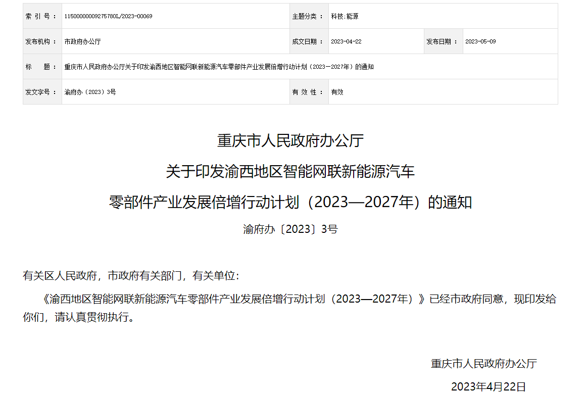 为进一步推动产业高质量发展,5月9日,重庆市人民政府办公厅印发了《渝西地区智能网联新能源汽车零部件产业发展倍增行动计划(2023—2027年)》(以下简称《行动计划》)。