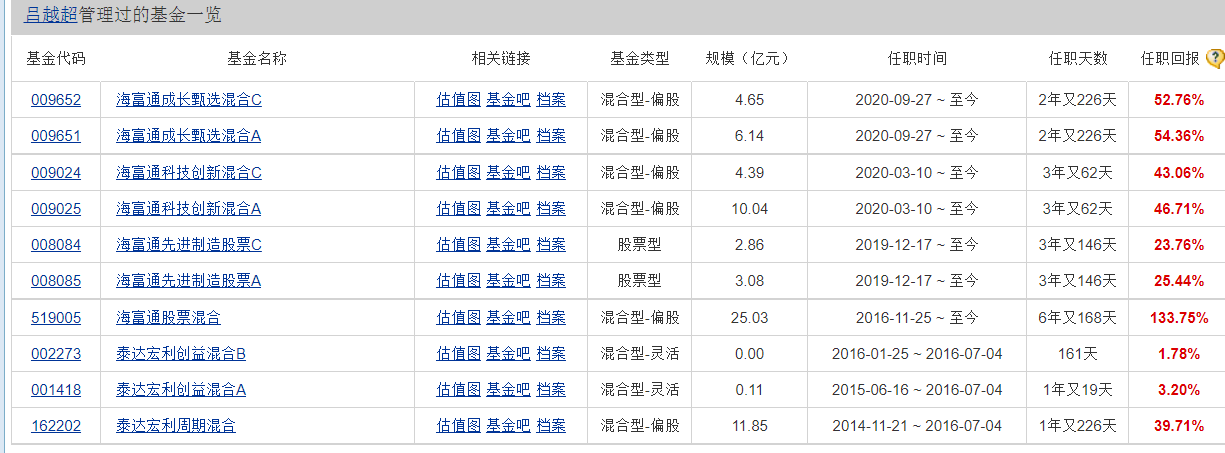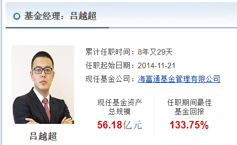 目前,吕越超在管基金规模56,18亿,都属于股票或混合型基金。而海富通基金公司眼下这两类基金合计资产为342亿,吕越超一个人就管理了其中的近1/6,因此,其在公司股票管理中有着重要地位。