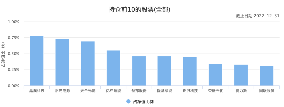从广发基金整体持仓上看,截至2022年12月31日,其持仓前十的股票中,多数为光伏、新能源行业。其中持有晶澳科技的基金数量为83只,天合光能基金数量为91只,亿纬锂能基金数量为111只。