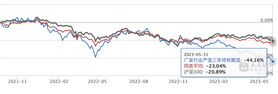 在刘格菘管理的六只基金中,广发行业严选三年持有期混合成立时间最短,亏损也最为严重。广发行业严选三年持有期混合自2021年8月26日成立以来,跌幅达到44.16%,远远跑输同类平均,跌幅甚至超过沪深300指数的两倍之多。