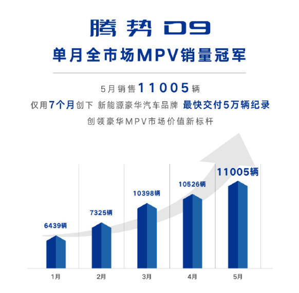 另外,腾势的成绩也相当漂亮。仅凭腾势D9一款产品,腾势汽车在今年5月就交出了11005辆新车的成绩,它也成为了7个月内突破5万交付大关的最快的新能源豪华品牌。