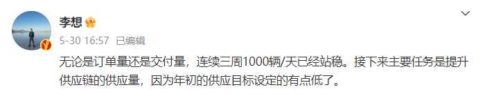 5月30日,理想汽车CEO李想曾在微博表示,无论是订单量还是交付量,理想汽车连续三周1000辆/天已经站稳。接下来主要任务是提升供应链的供应量,因为年初的供应目标设定的有点低了。