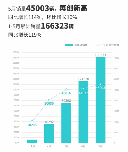 另一家销量持续破纪录的车企是埃安。5月,埃安一共交付了45003辆,同比增长114%,环比增长10%,依旧能打。