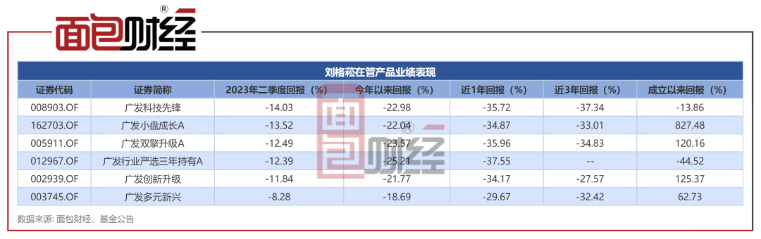 从基金收益来看,刘格菘在管产品二季度收益均为负,且跑输同期业绩比较基准,平均回撤超12%。今年以来(截至7月20日)6只产品收益在-18.69%至-25.21%之间,表现较弱。