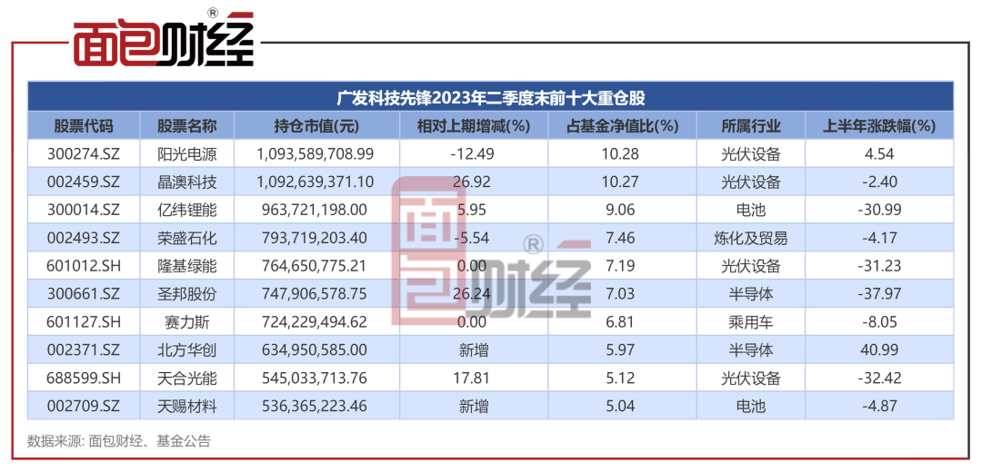 具体来说,广发科技先锋二季度前十大重仓股包括阳光电源、晶澳科技、亿纬锂能、荣盛石化、隆基绿能等。从持仓变动来看,该产品二季度重仓股新增了北方华创和天赐材料,主要加仓了晶澳科技、圣邦股份、天合光能以及亿纬锂能,同时对阳光电源和荣盛石化进行了减持。