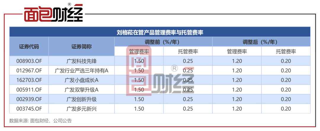 广发基金此次共对旗下119只产品的管理费率和托管费率进行了调整,其中包含刘格菘的6只在管产品,管理费率均由1.5%调降至1.2%,托管费率由0.25%将至0.2%。
