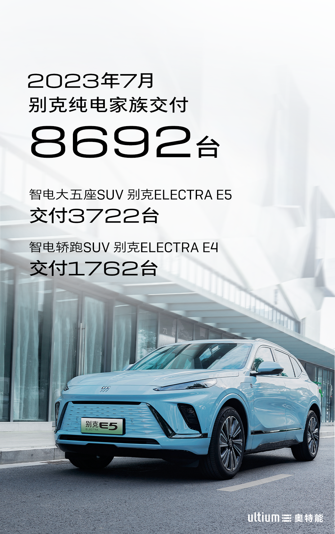 具体来看,别克奥特能车型7月合计交付5,484台,其中智电大五座ELECTRA E5是绝对主力,7月交付3,722台,累计交付8,340台;智电轿跑SUV ELECTRA E4上个月交付1,762台,销量稳健爬坡中。
