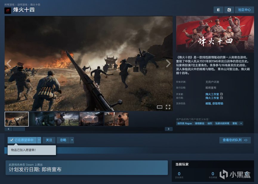 目前《烽火十四》正在努力开发中,制作组预计与一年内推出试玩demo,最初的试玩版本预计从平型关、阳明堡、南京保卫战这三个场景战役中选择其一向玩家展示。游戏现已开启STEAM商店页面,感兴趣的玩家可以关注一波!
