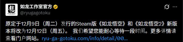 RGG工作室宣布,原定于12月9日登陆Steam的《如龙:极》和《如龙:极2》将延期至12月12日发售。此次延期旨在为游戏新增包含简体中文在内的多语言支持。