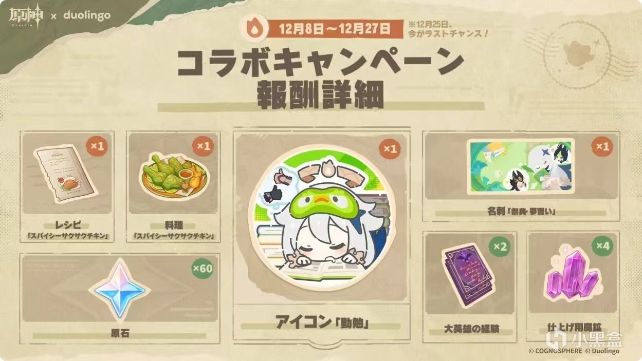 ▌活动奖励 1. 在Duolingo应用中参与“原神任务”,完成任意课程,冲击连续打卡天数+3目标; 2. 奖励:原神×Duolingo联动兑换码; 3. 兑换码包含:图标“勤勉”×1、名片“祭典·梦习”×1、食谱“香酥香辣鸡”×1、料理“香酥香辣鸡”×1、原石×60、精锻用魔矿×4、大英雄的经验×2;