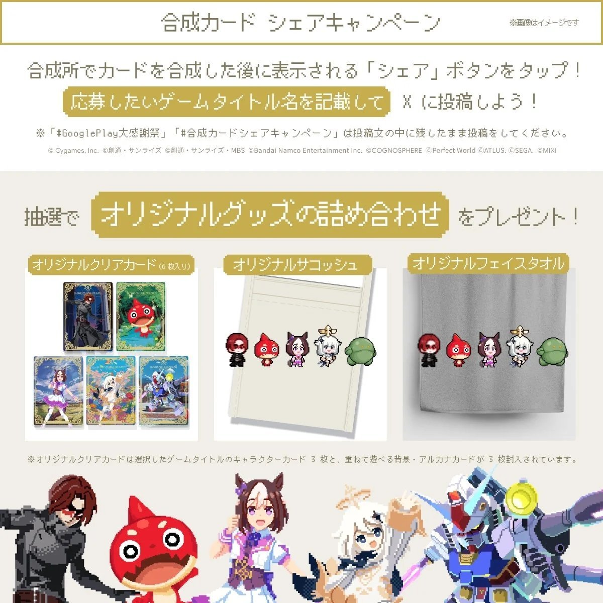 参与活动攻略主线剧情、与各类角色互动,即可收集“钻石”;使用钻石参与抽奖,有机会赢取Google Play点数及联动游戏周边好礼。今年,《赛马娘 Pretty Derby》《原神》《怪物弹珠》将继续登场,《SD高达G世代 永恒》《女神异闻录5:The Phantom X》则首次加盟!《王者天下》《白茫生存》《多邻国》《绯红结系》的角色也可能现身活动!