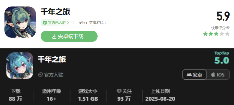只不过这次“复活赛”的表现也谈不上有多理想,今年8月,重新复活后的《千年之旅》再次上线。好游快爆以及TapTap分别只有5.9分以及5.0分,iOS游戏免费榜只达到了五十来名,畅销榜更是难以掀起水花。